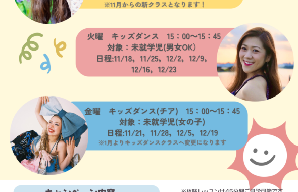 子ども向けレッスンとしてキッズダンスとリトミック、大人向けレッスンとしてヨガ、ピラティス等のレッスンをご用意しています。