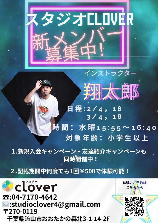 スタジオcloverは、「流山に四つ葉をお届け」をコンセプトに、ヨガやダンスといったスタジオプログラムを通して健康作りや、健やかな成長をサポートします。