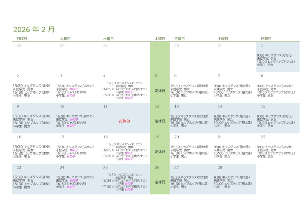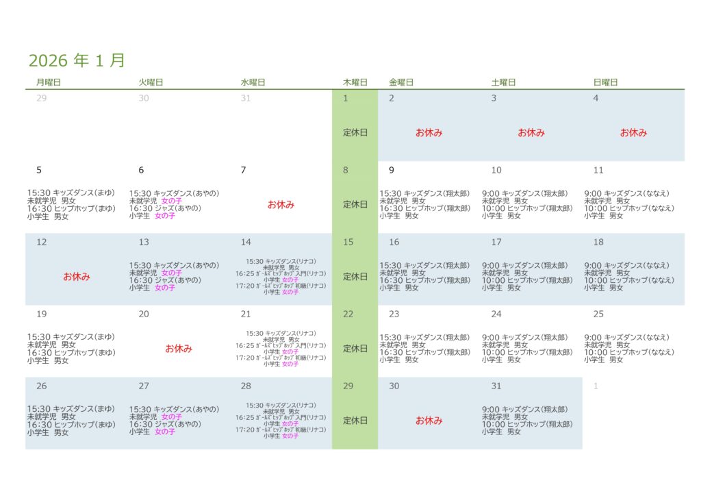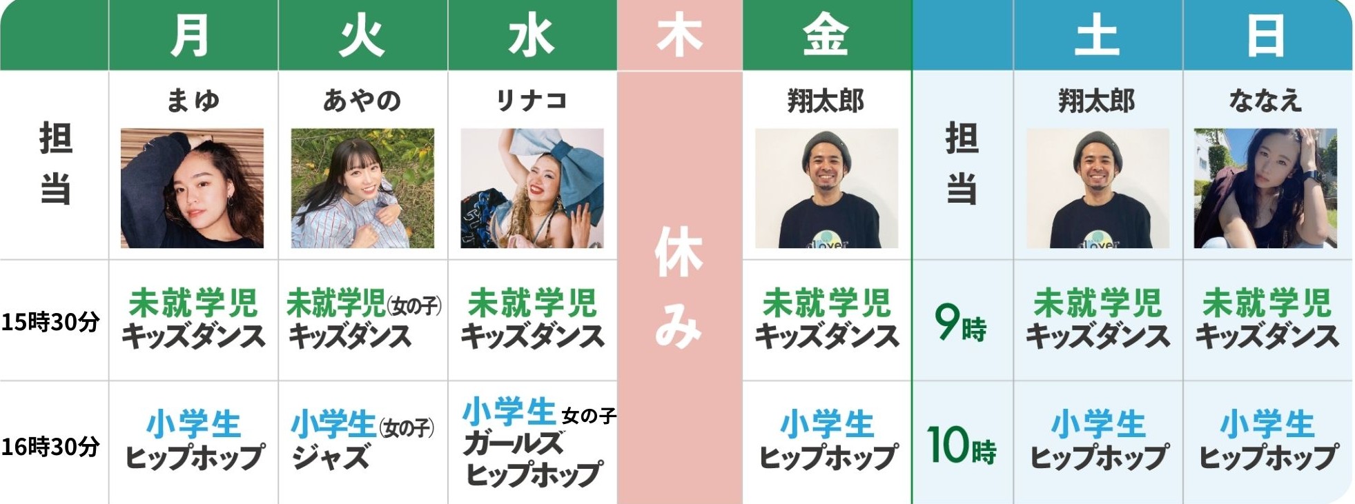 例)月曜15時30分未就学児キッズダンス、月曜16時30分小学生ヒップホップ入門、月曜17時30分小学生ヒップホップ初級